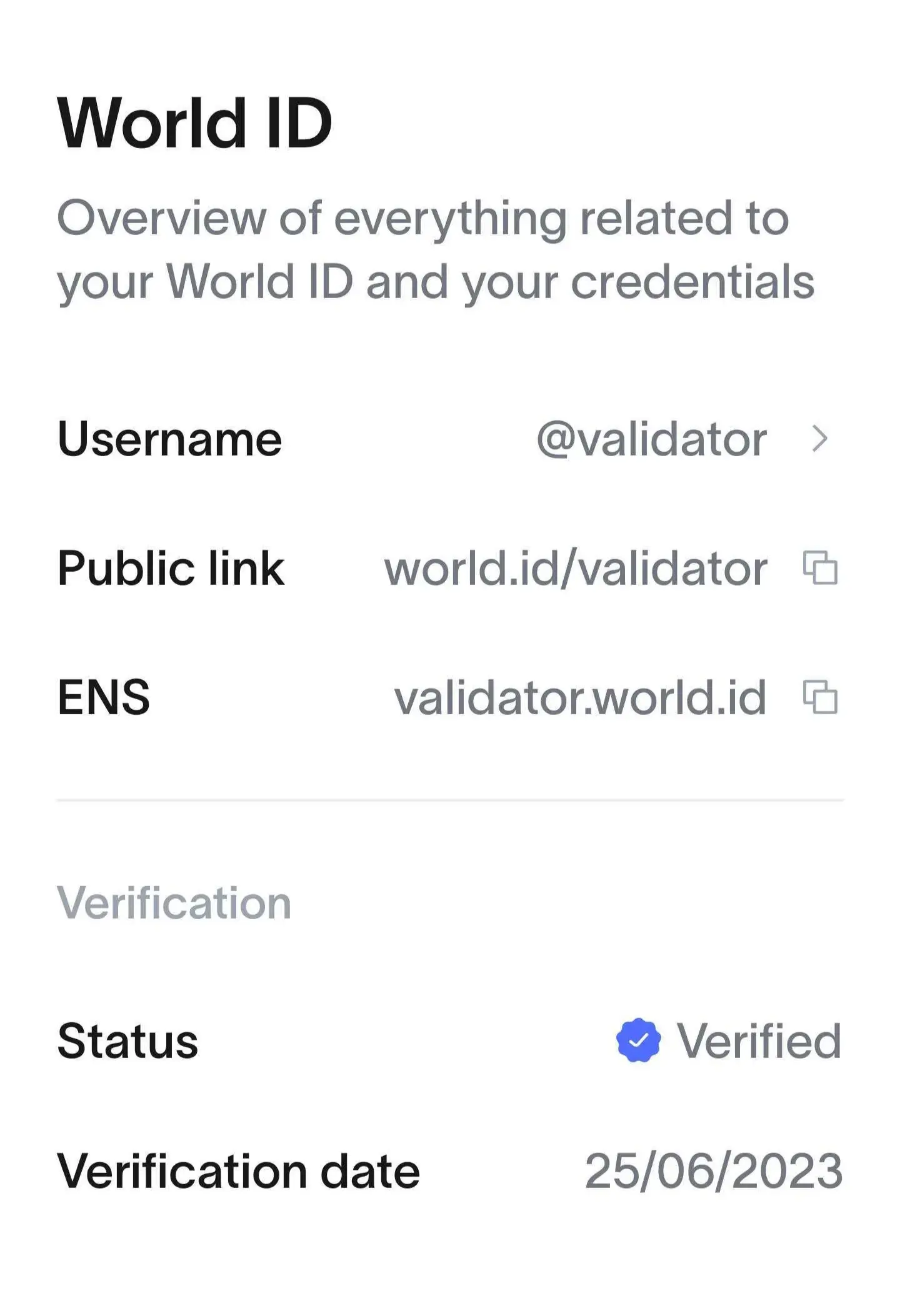What looks like a familiar handle in the World app, like @validator, is in fact a subname of the domain world.id under the hood, and therefore a resolvable ENS name. Therefore, the full username is validator.world.id, as seen in the account settings. The .id TLD offers a short, chain-agnostic, identity-related domain that works in favor of global communities like World.
