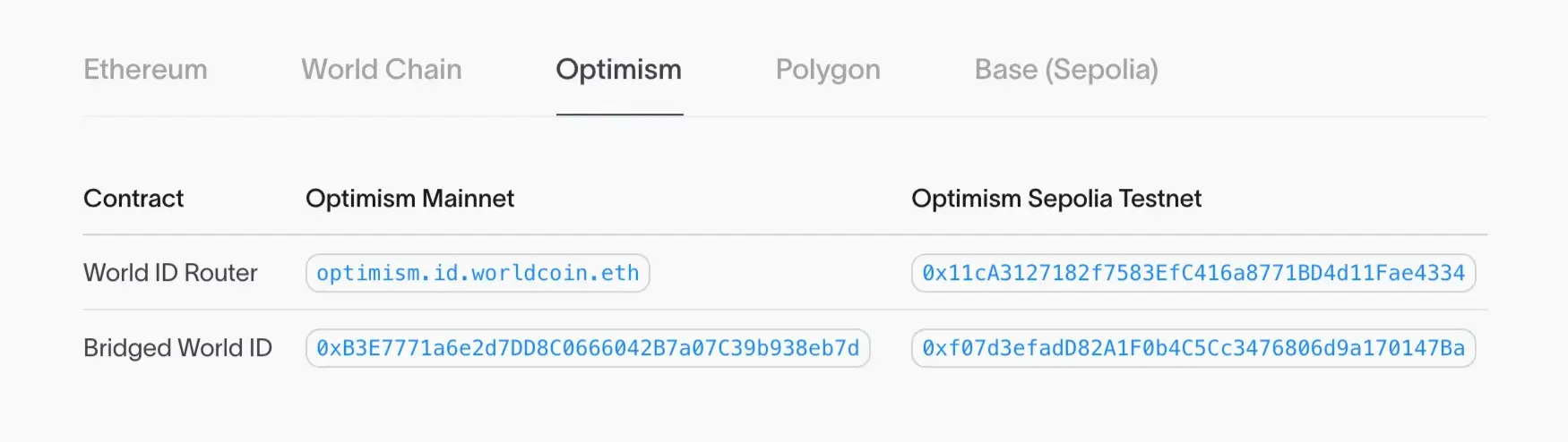 World brings the same practice to its smart contracts, maintaining a public address book that lists each deployment alongside a corresponding ENS name. This address book includes multiple networks: On Ethereum mainnet the router resolves at id.worldcoin.eth, on Optimism it is optimism.id.worldcoin.eth, and on Polygon it’s polygon.id.worldcoin.eth.